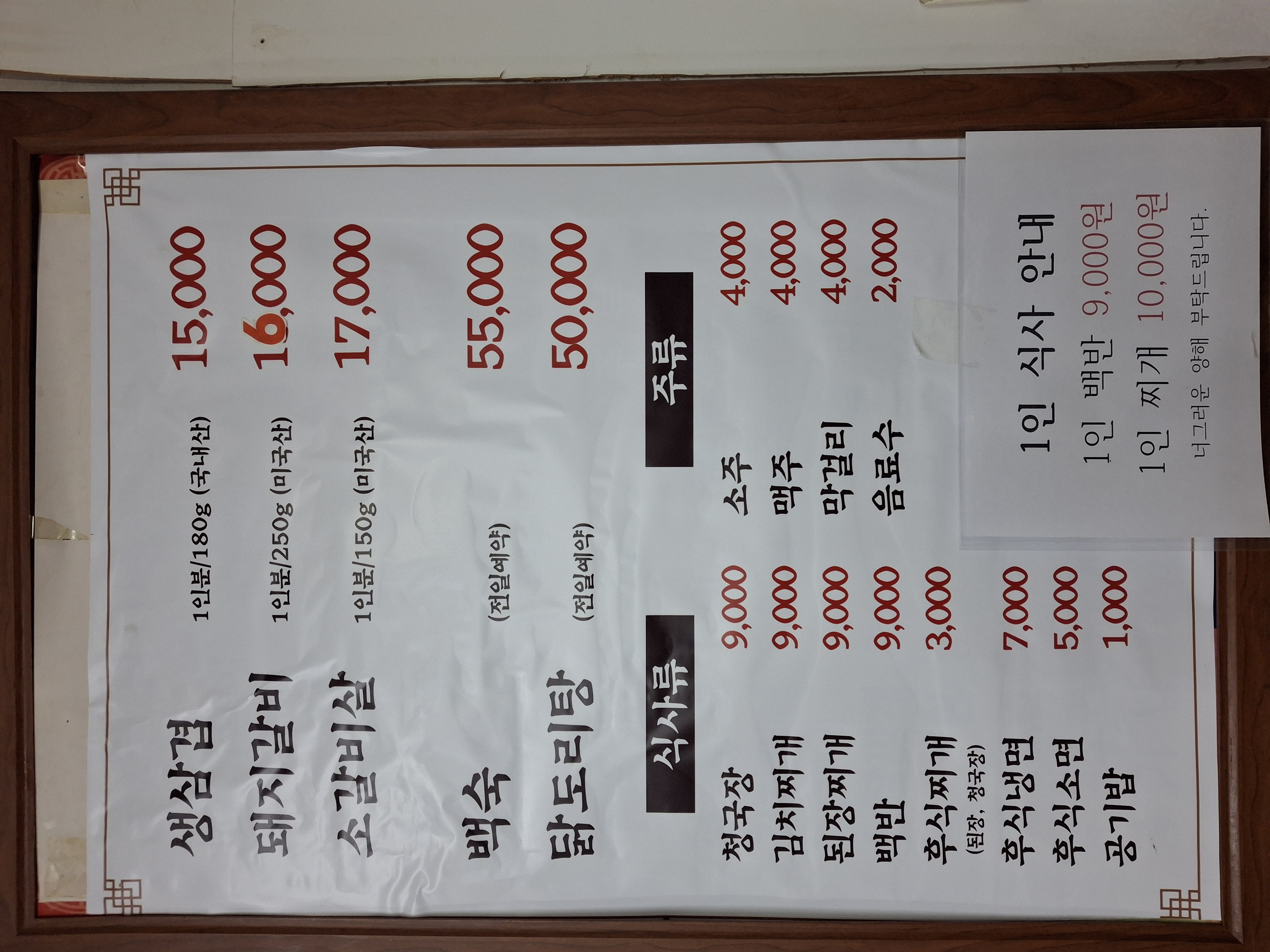 생삼겹 15,000원(☆) / 된장찌게 9,000원