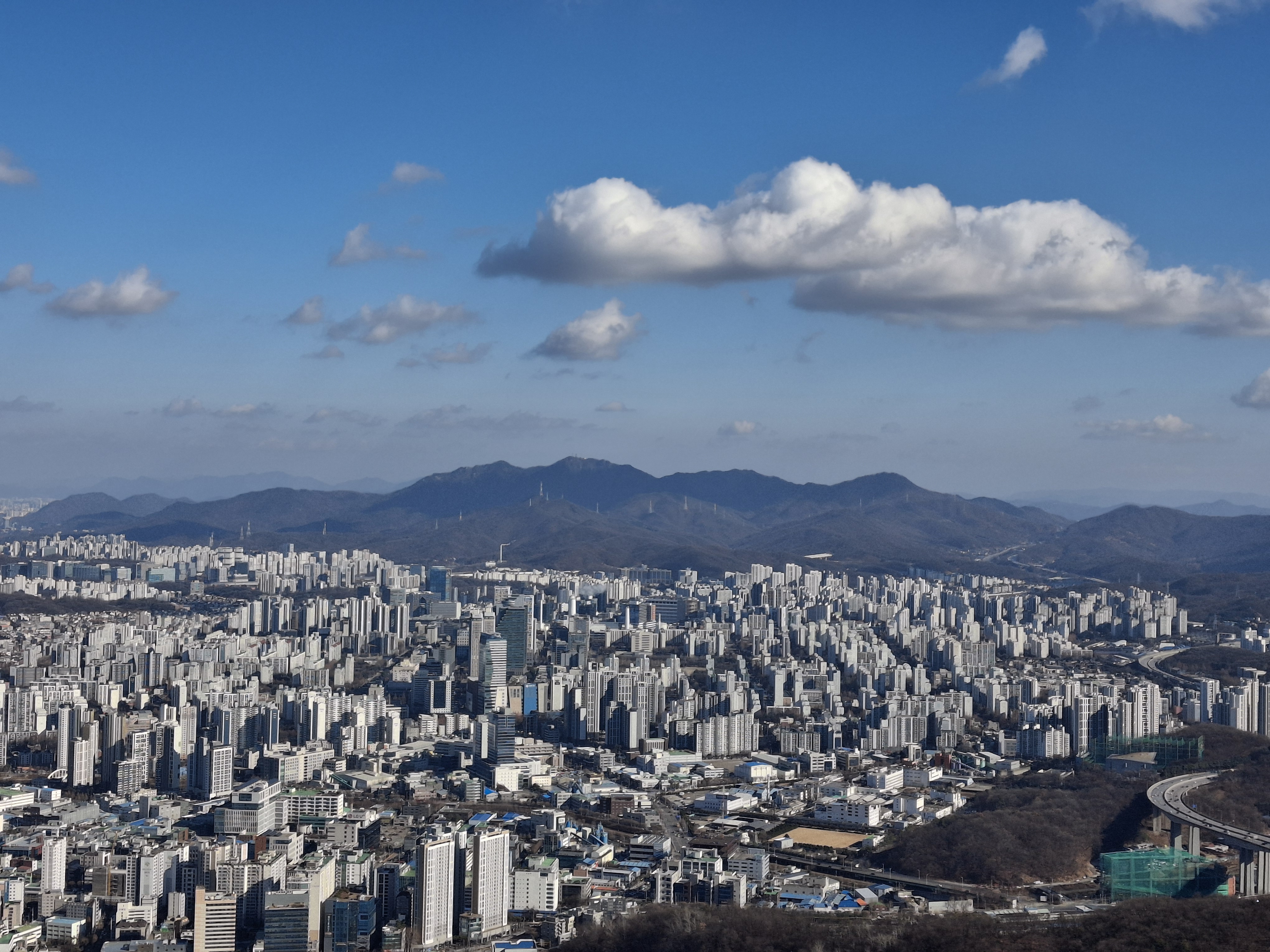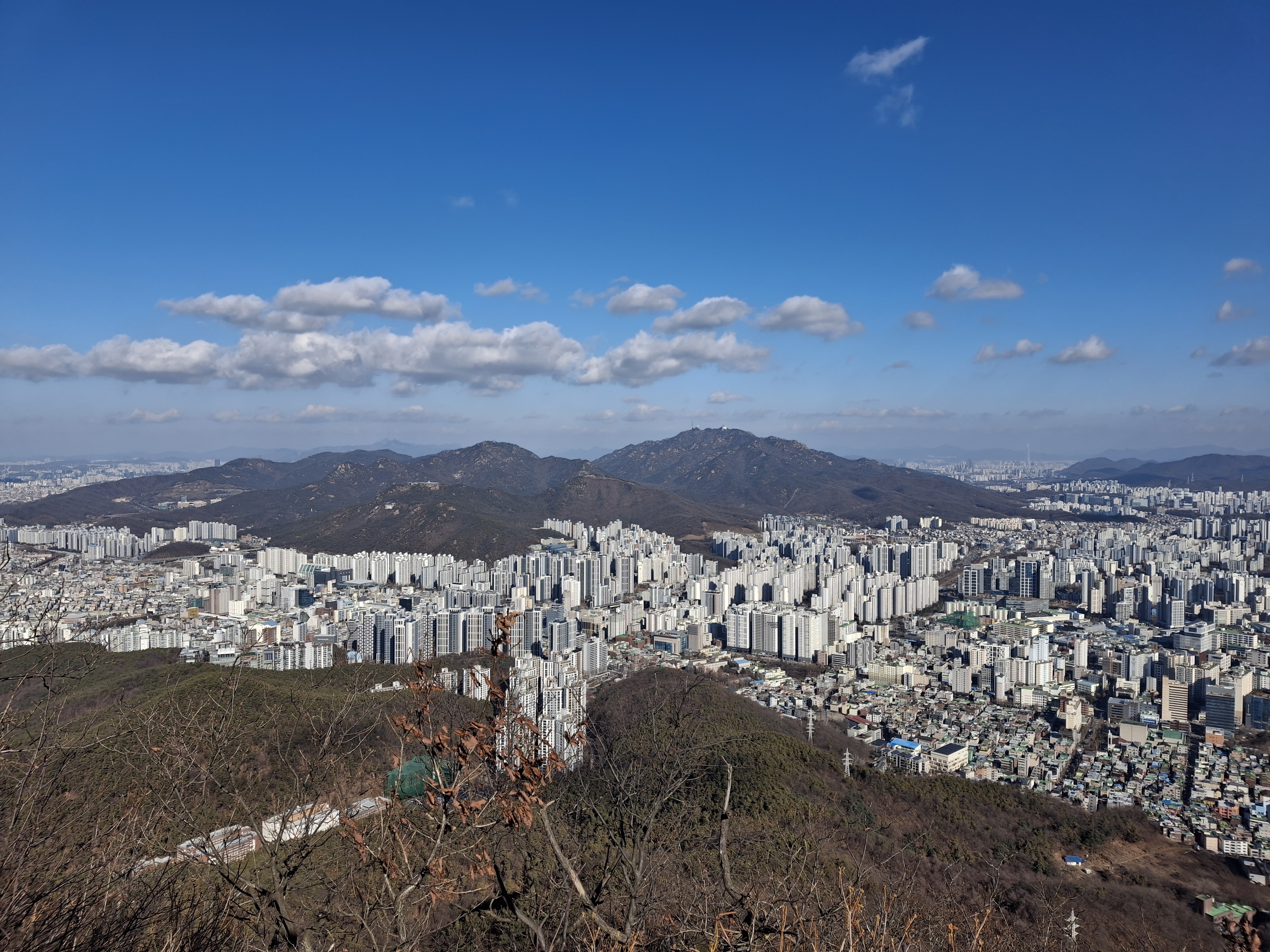 수리산은 한강 남쪽에서 서울을 감싸고 있으며 남북으로 능선이 길게 뻗어 있다.