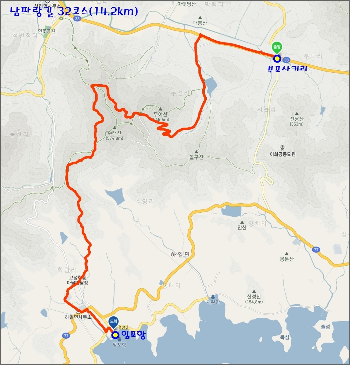 - 종점: 고성군 하일면 학림리 1518 임포항 방파제