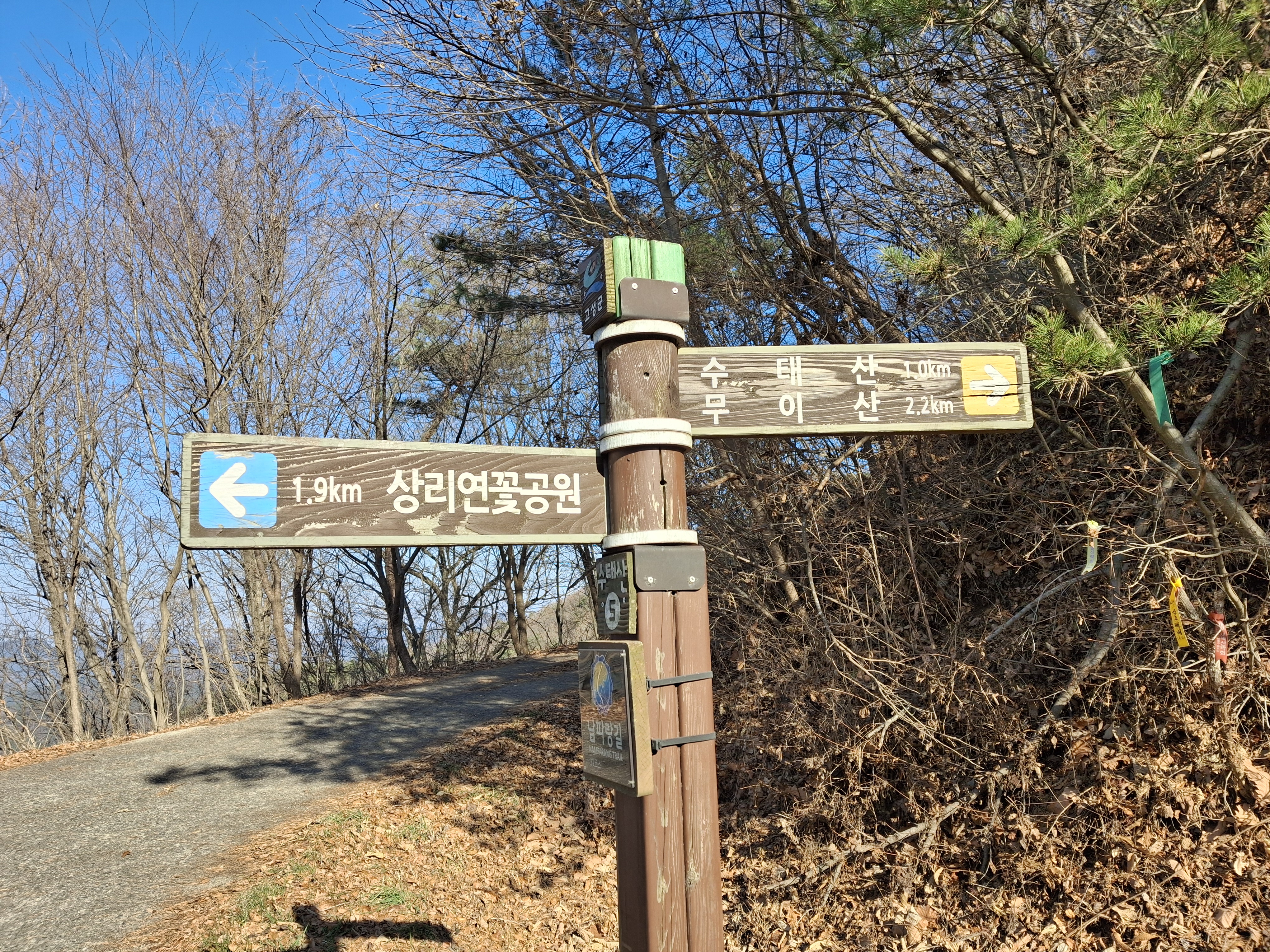 와룡지맥 통과 → 상리연꽃공원 갈림길 → 와룡지맥 수태재 → 자란만 전망대쉼터 → 나무데크 공사중 →