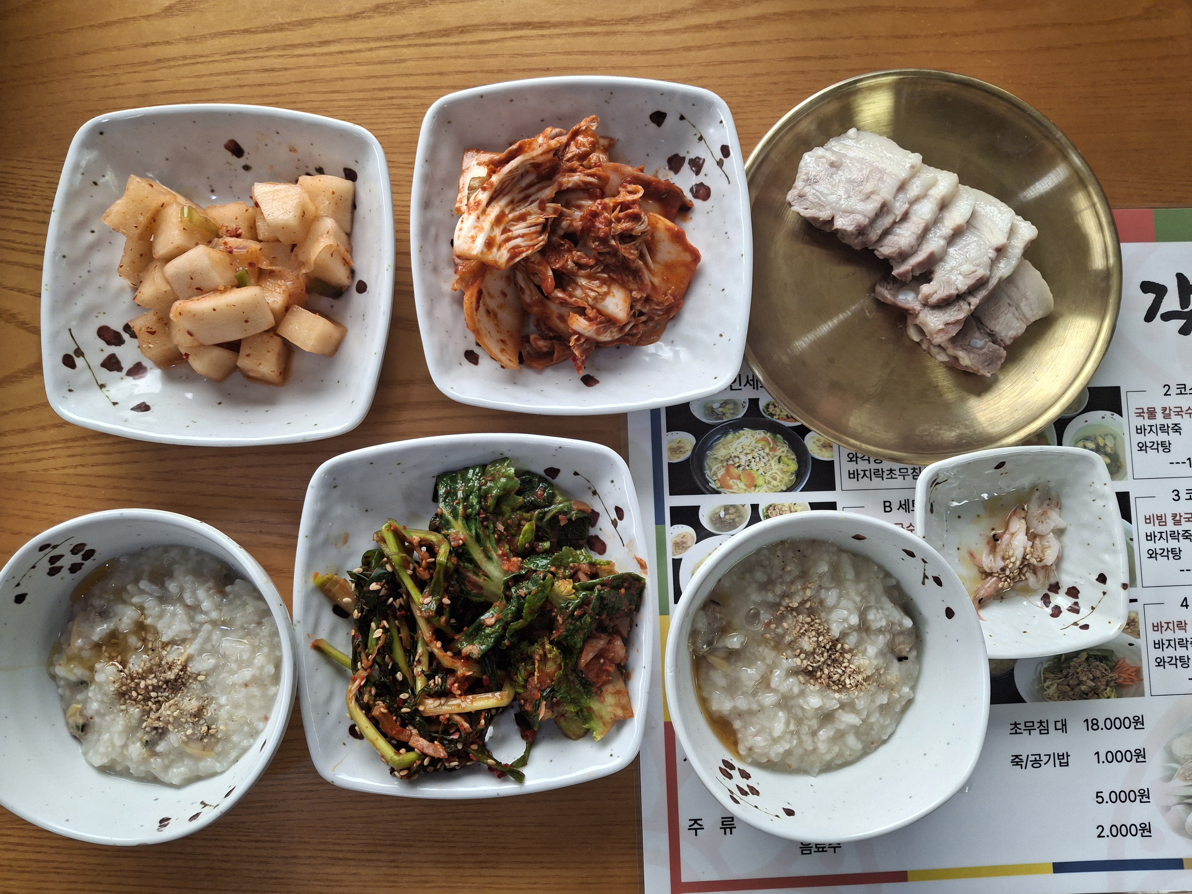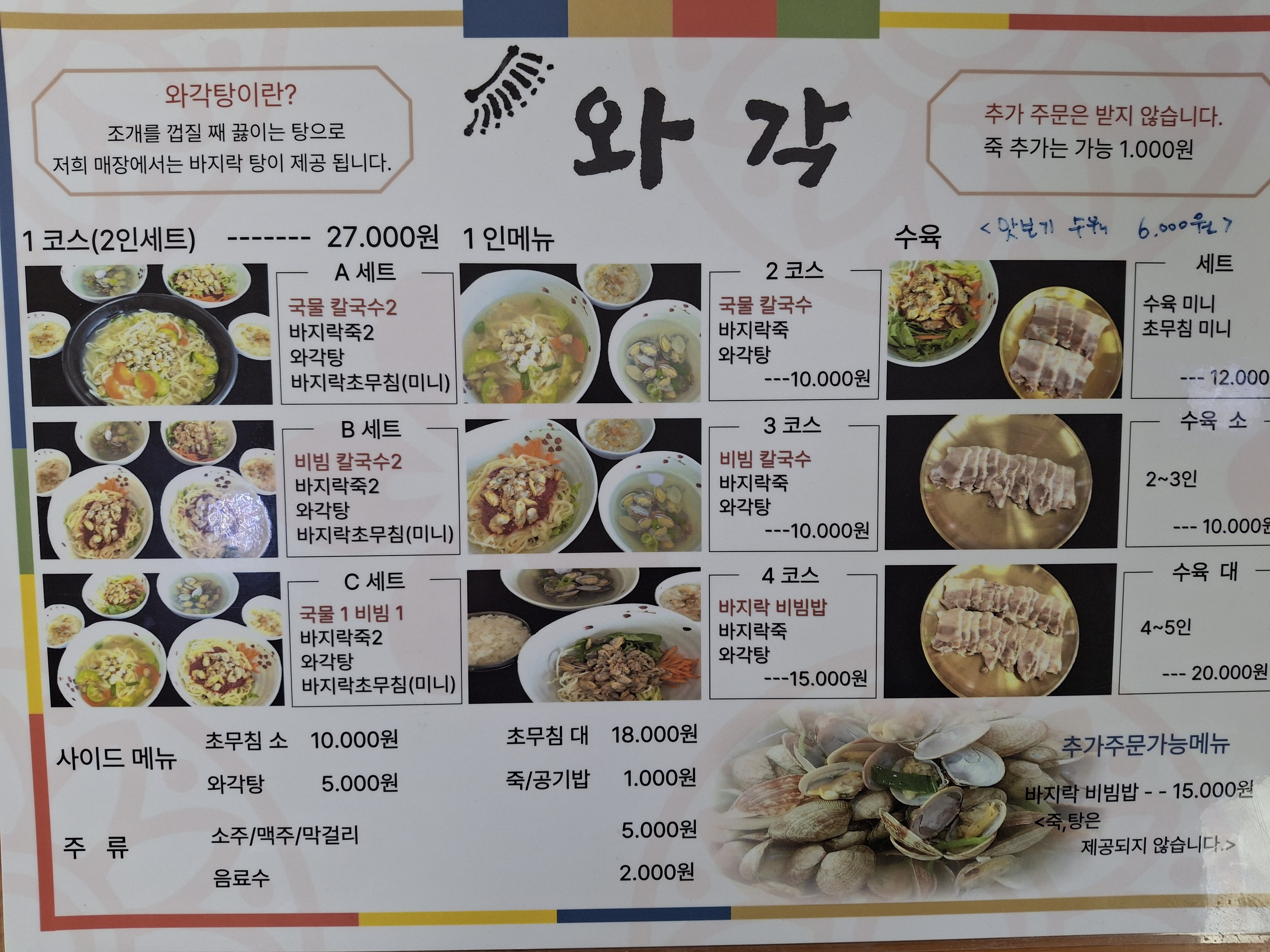 국물/비빔칼국수+바지락죽+와각탕 10,000원(★) / 맛보기수육 6,000원(★)
